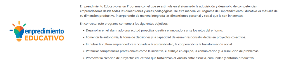 A cargo de nuestra profesora de Economía, Isabel Mata, se ha diseñado un proyecto para favorecer que el alumnado adquiera las competencias y habilidades emprendedoras adecuadas a cada etapa educativa, con metodología de aprender-haciendo y pasando por las diferentes fases del proceso de emprendimiento educativo: Explora-Desarrolla-Presenta.