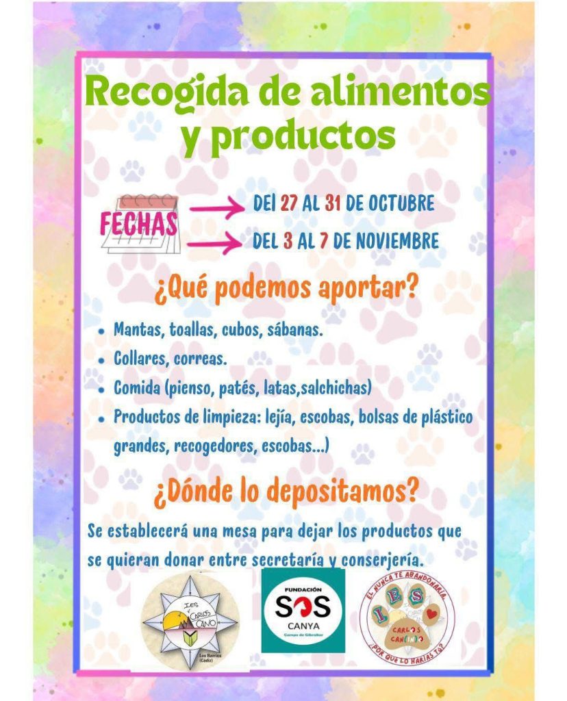 El proyecto, que hemos denominado IES CARLOS CAN(IN)O, tiene como objetivo principal colaborar con la fundación Canya SOS Campo de Gibraltar, más conocida como SOS Perrera de Los Barrios que actualmente está cuidando y alimentando alrededor de 200 perros. El centro ha decidido desarrollar varias actividades de participación voluntaria por parte del alumnado del centro, con el objetivo de concienciar en el presente sobre el abandono animal, a quienes formarán parte de nuestra futura sociedad. Entre las actividades programadas están la recogida de materiales y alimentos para la protectora, un mercadillo solidario que tendrá lugar en el recreo y en el cual se venderán manualidades hechas por el propio alumnado del centro, apadrinamiento de un perrito por clase y apadrinamiento de unos 6 perritos por el claustro de profesores.